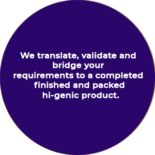 We translate, validate and bridge your requirements to a completed finished and packed hi-genic product.