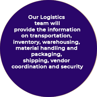 Our Logistics team will provide the information on transportation, inventory, warehousing, material handling and packaging, shipping, vendor coordination and security