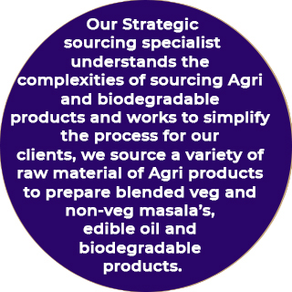 Our Strategic sourcing specialist understands the complexities of sourcing Agri and biodegradable products and works to simplify the process for our clients, we source a variety of raw material of Agri products to prepare blended veg and non-veg masala’s, edible oil and biodegradable products.